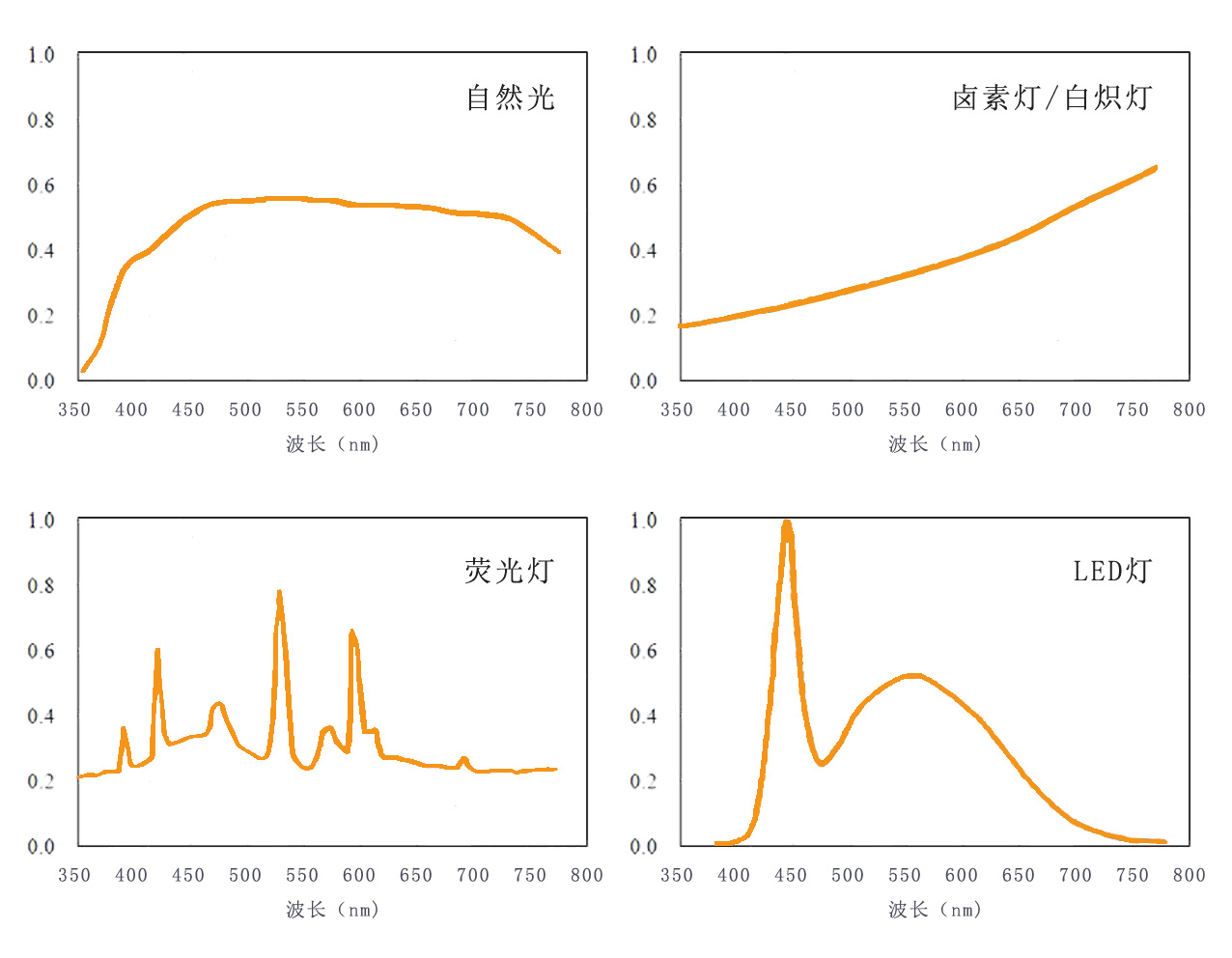 下图为各种光源在人眼可见部分的光谱(波长为400-700nm),其中自然光的光谱是连续的,且非常平缓,没有尖锐的高峰和低谷。卤素灯/白炽灯的光谱也是连续的,但其红外成分比例偏大。荧光灯和LED的光谱不连续,其中三基色的荧光灯有三个小峰,LED灯则在蓝光处有个明显尖峰(这导致了的众所周知的蓝光安全性问题)。