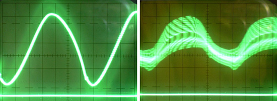 (2)用专业的示波器测量,示波器测量并显示光线波形的幅度和频率,非常准确。示波器观察到的频闪波形如下图。